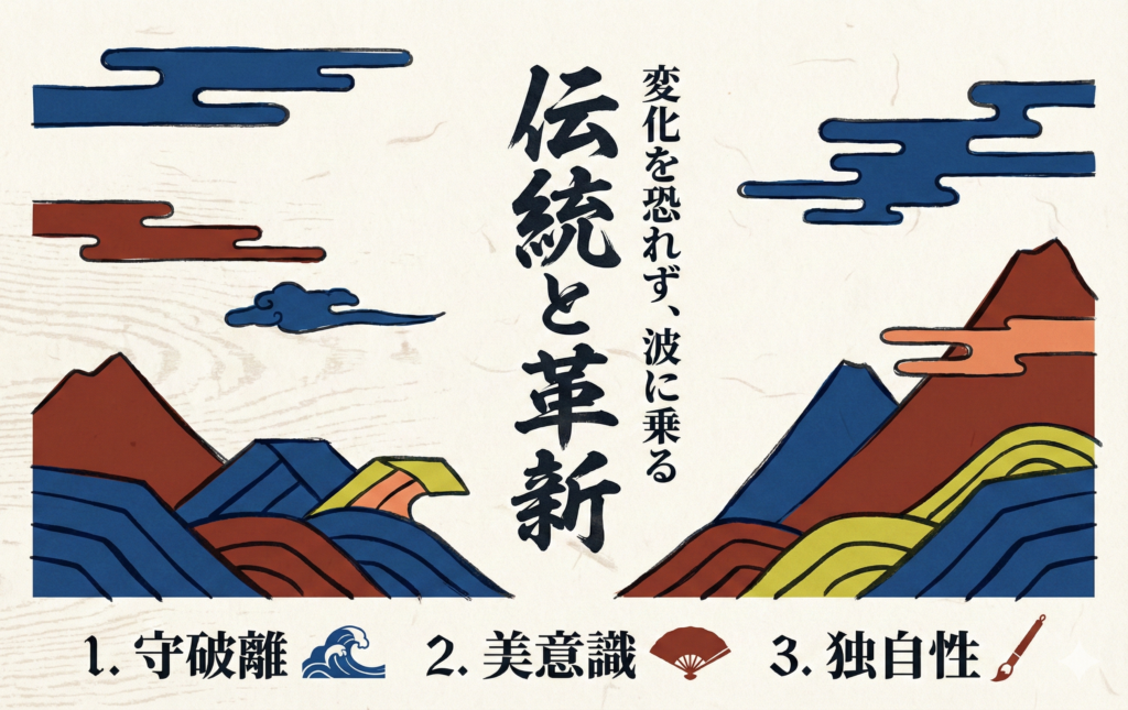 「伝統と革新」というテーマだけでなく、テキスト部分を書き換えることで「新商品発表」や「企業理念」など、格式高いメッセージを伝えたいあらゆるシーンで活用できます。ぜひ、あなたのコンテンツに合わせて、テキスト内容をアレンジして試してみてください。