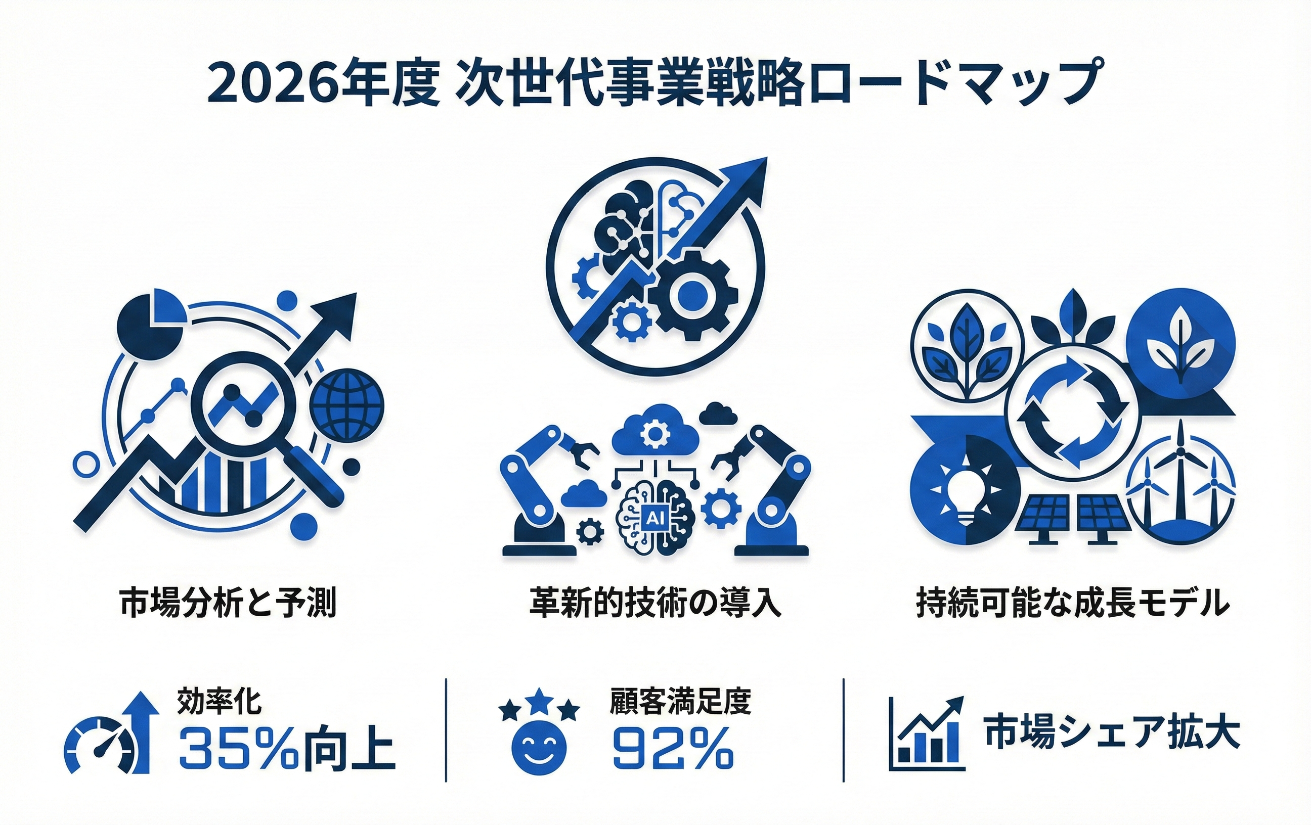 下部の数値データ: 効率化 35%向上 / 顧客満足度 92% / 市場シェア拡大